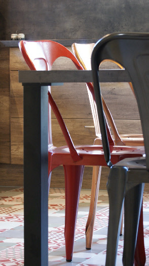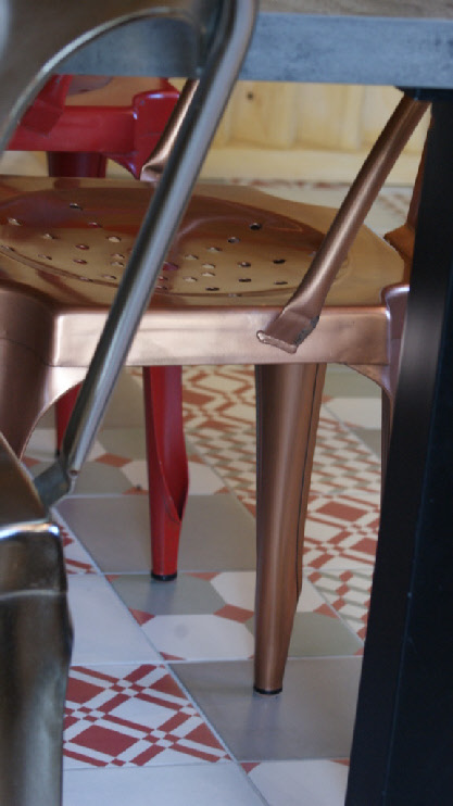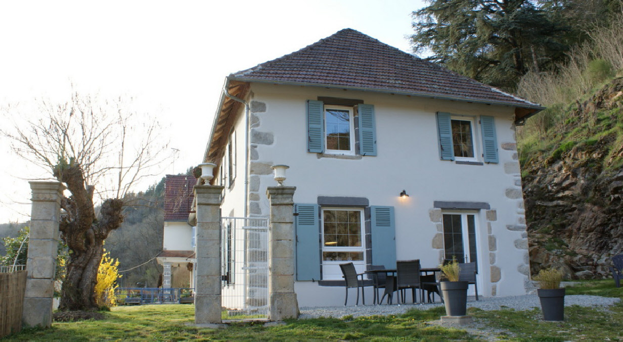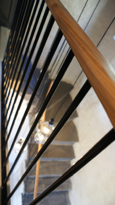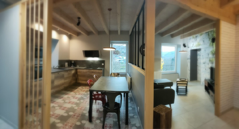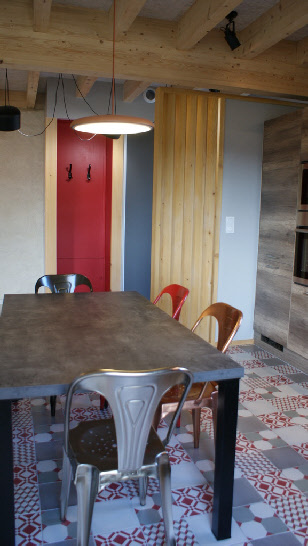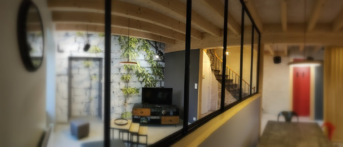 Le parti pris, conserver les éléments du passé comme le garde corps restauré et recréé partiellement ou la récupération des matériaux d’origine comme la brique avec l’évier d’époque, l’escalier en pierre de Volvic, également présente en façade, les poutres qui pouvaient être sauvées ont été sablées...